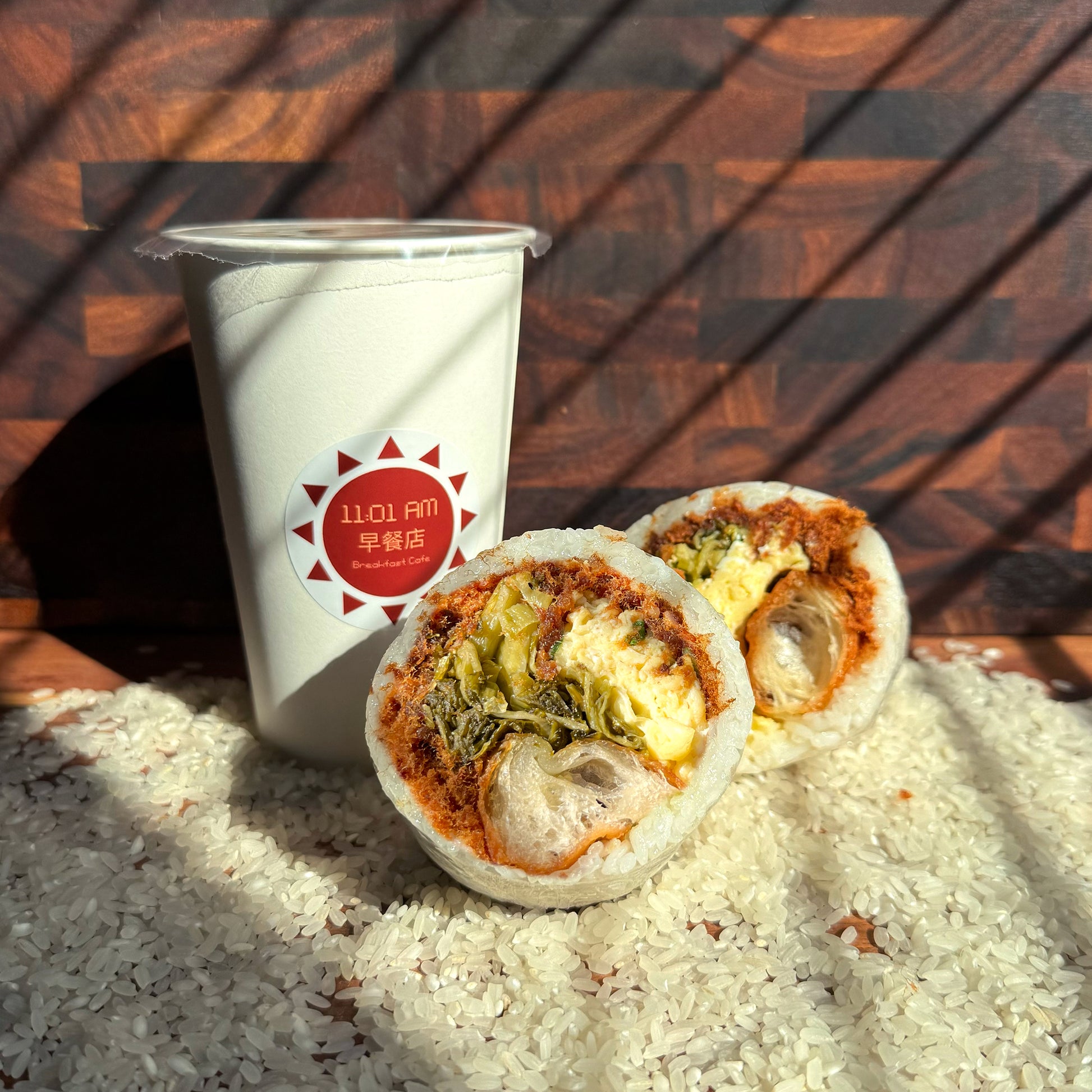 White Rice, Glutinous Rice, Pork Floss, Pickled Mustard Green, Scallion Egg, Fried Cruller